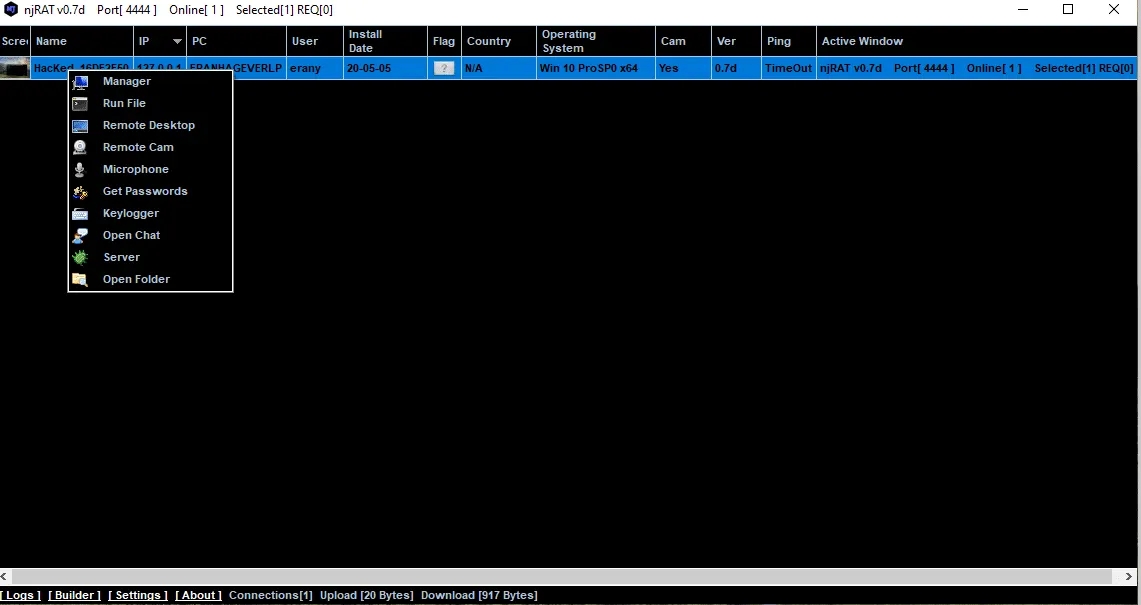 njRAT, also known as Bladabindi, is a remote access tool with user interface or trojan which allows the holder of the program to control the end-user’s computer. It was first found in June 2013 with some variants traced to November 2012,njRat was made in the .net language.