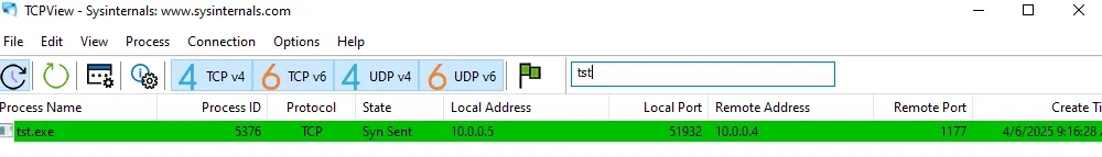 tst.exe is sending a syn packet again and again killing and reviving the process till it establishes a connection lets open up wireshark in our remnux machine or even windows vm is fine Its Using Port 1177 and 10.0.04 as Remote Address cause i am using inetsim in my remnux device