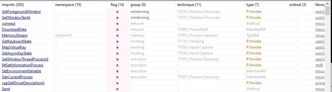1)Flagged Imports GetForegroundWindow — Retrieves the active window handle (used for spying on user activity). GetWindowTextA — Gets text from the active window (used to capture window titles). connect — Establishes a network connection (used for command and control). DownloadData — Downloads data from a remote URL (used to fetch payloads). MemoryStream — Handles in-memory data streams (used for fileless execution). GetKeyboardState — Captures the state of keyboard keys (used for keylogging). MapVirtualKey — Maps virtual key codes to characters (used in input interpretation). GetAsyncKeyState — Checks key presses in real time (used for keylogging). GetWindowThreadProcessId — Gets process ID from a window handle (used for targeting processes). NtSetInformationProcess — Modifies process information (used for evasion or stealth). SetEnvironmentVariable — Sets environment variables (used to influence execution behavior). GetCurrentProcess — Gets a handle to the current process (used for self-injection). capGetDriverDescriptionA — Gets capture device info (used for webcam or audio spying). Send — Sends data over a network socket (used for exfiltration).