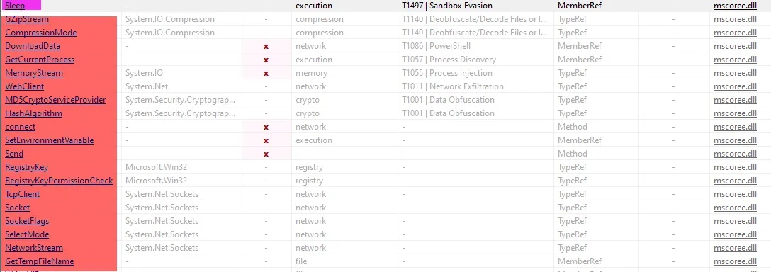 Sleep — Pauses execution (used for sandbox evasion or timing delays). GZipStream — Handles GZip data compression (used to compress or obfuscate payloads). CompressionMode — Specifies compression type (used with GZipStream for decompression). DownloadData — Downloads remote data (used to fetch payloads or commands). GetCurrentProcess — Gets current process handle (used in self-injection or process manipulation). MemoryStream — Operates on data in memory (used for fileless payloads). WebClient — Facilitates HTTP requests (used for downloading or exfiltrating data). MD5CryptoServiceProvider — Generates MD5 hashes (used in obfuscation or verification). HashAlgorithm — Provides base for hashing functions (used in encoding/obfuscation). connect — Establishes a network connection (used for C2 communication). SetEnvironmentVariable — Sets or modifies environment variables (used to influence execution). Send — Sends data over a socket (used for exfiltration or beaconing). Registry — Accesses Windows registry (used for persistence or configuration). RegistryKey — Interacts with registry keys (used to read/write settings). RegistryKeyPermissionCheck — Specifies registry access level (used to bypass permission checks). TcpClient — Establishes TCP connections (used for C2 or data transfer). Socket — Creates low-level network sockets (used for custom networking). SocketFlags — Specifies socket send/receive options (used in network customization). SelectMode — Specifies how sockets are selected (used for handling multiple connections). NetworkStream — Manages data streams over sockets (used in network communication). GetTempFileName — Creates a temp file path (used for staging or unpacking payloads).