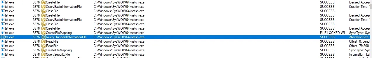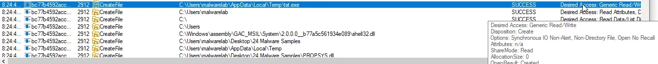 It Created a file in AppData\Local\Temp\tst.exe hovering over the Desired Access It Says Generic Read/Write we’ll get back to tst.exe lets see what we get if we set the ParentPid as 2912 in filter