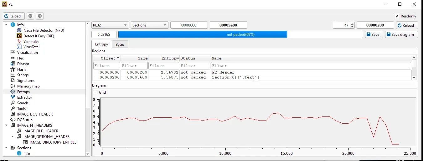 Detect It Easy Indicates its not packed with a rating of 69%.